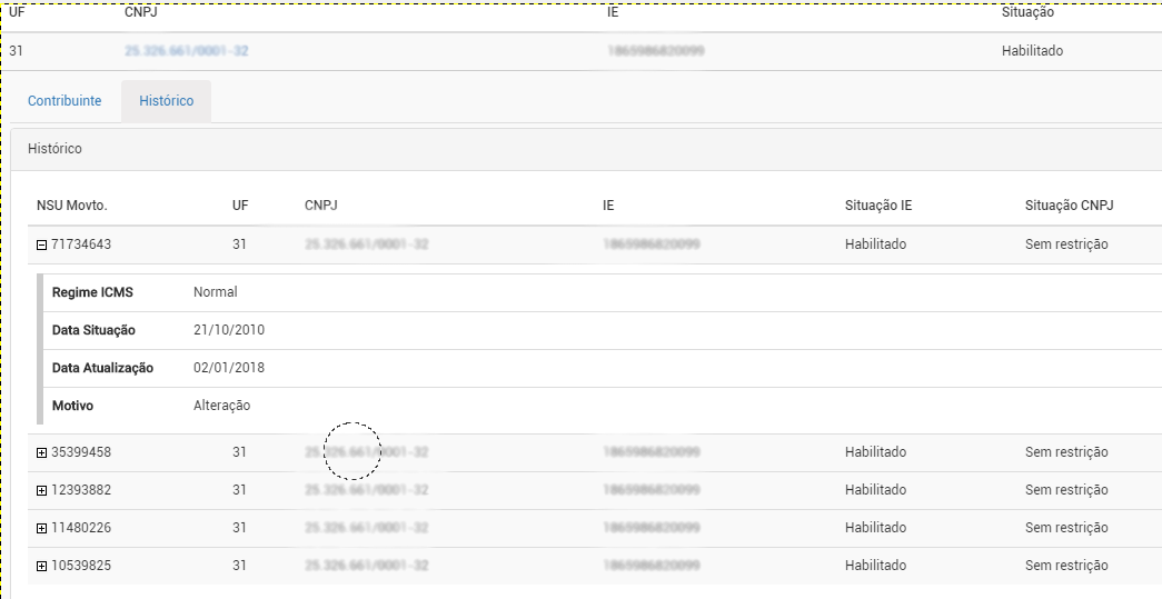 Todas as Inscrições Estaduais vinculadas a pessoa jurídica pesquisada serão exibidas, na mesma página com os resultados, pode ser checada junto com a IE a situação junto ao órgão estadual.