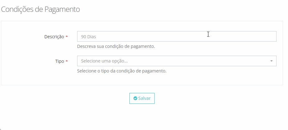 Descrição: Informe o nome que melhor faça referência à condição. Exemplo: 120 dias ou 30,60,90,120 dias. No caso do segundo exemplo mostra que o prazo é de dias entre as parcelas.