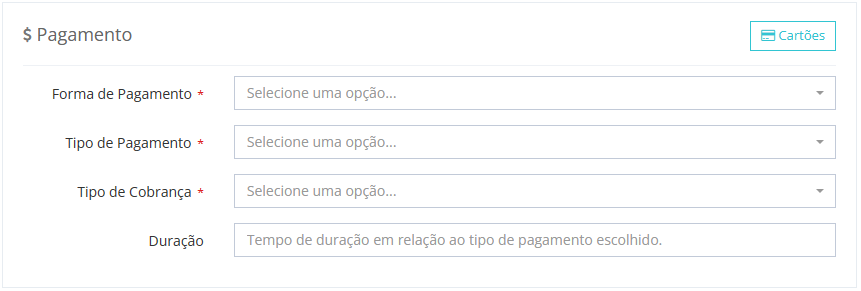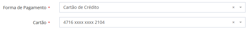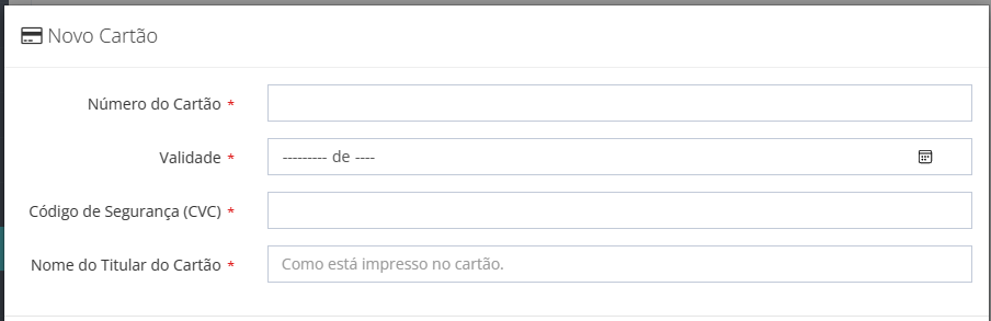 Ao clicar no botão Cartões ou ao selecionar forma de pagamento Cartão de crédito, na guia Pagamento irá exibir o formulário de cadastro de cartão: