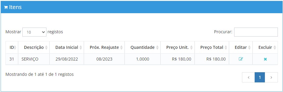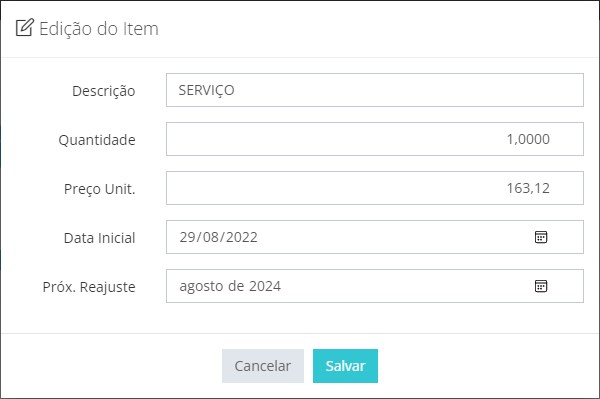 ✳️ Ao adicionar um item ao contrato será definido o mês atual e próximo ano como a próxima competência de reajuste para este item. Caso deseje alterar a data de reajuste ou valor inicial do item do contrato, clique em Editar.