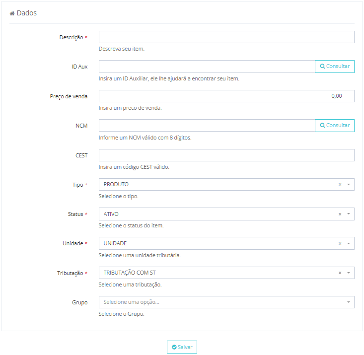 CEST: Caso necessário, informe o código CEST. Somente itens com substituição tributária de ICMS obrigam este código na emissão de documentos fiscais. Solicite estes códigos com a contabilidade.