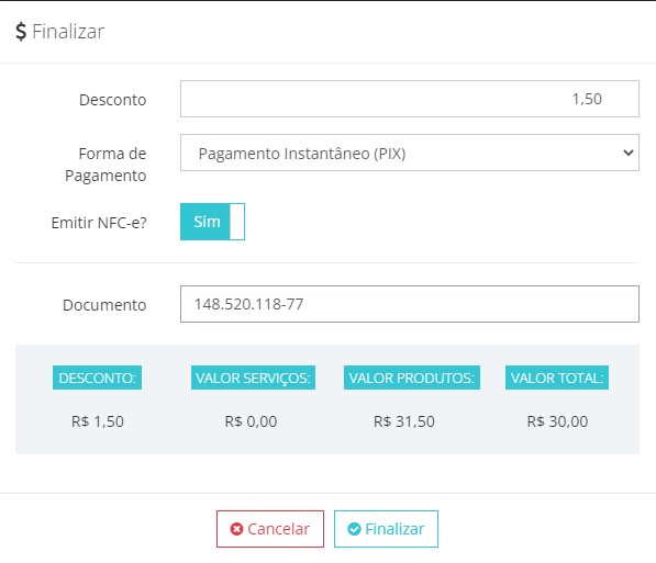 2. Informe os campos pertinentes a venda (Documento: CNPJ ou CPF é opcional) e clique em Finalizar:
